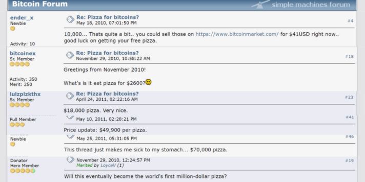Even at that time, this seemed like a very generous offer as it amounted to $41 at the time, but very soon Bitcoin started gaining popularity and hence the price updates began. People were astonished by the value of these pizzas rising to what seemed astronomical levels, one user feeling sick over the figure of $70 000 back in 2011 and another one joking if this could one day be the first million dollar pizza… (well, technically two pizzas…)