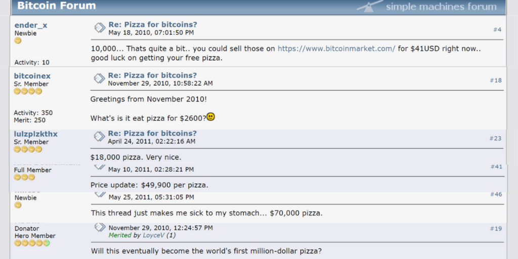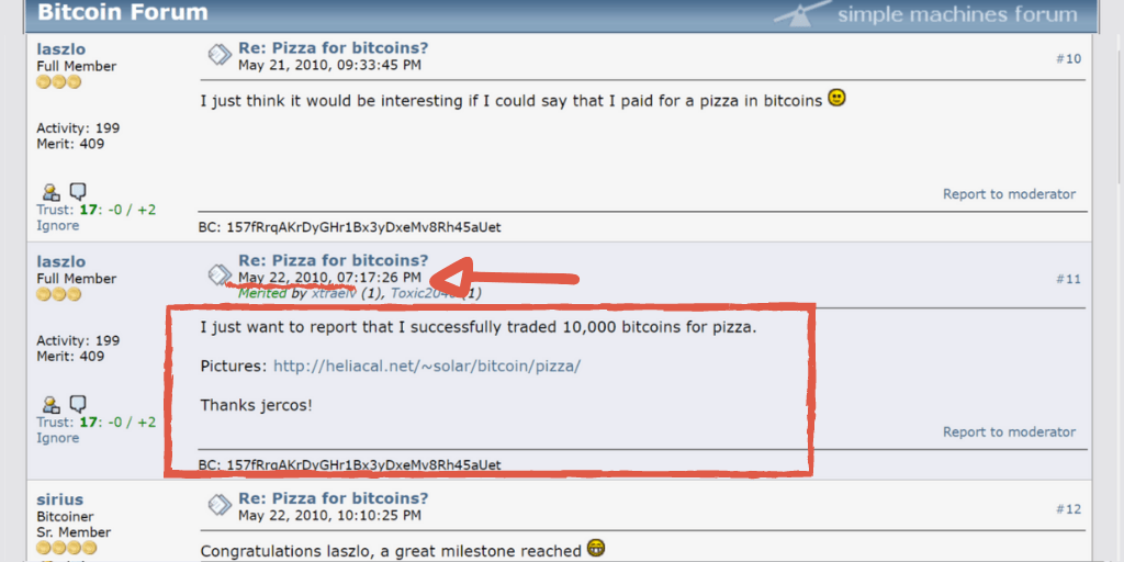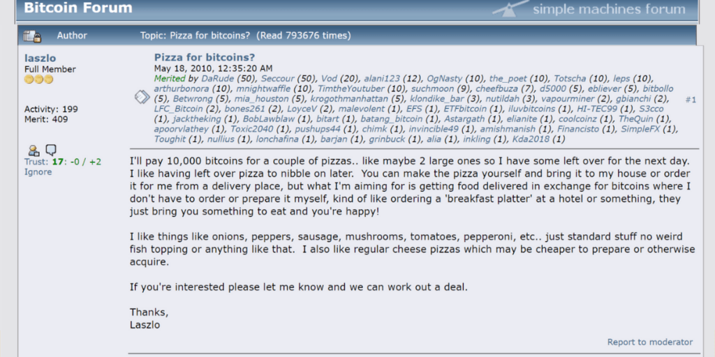 On May 18th 2010 a user on Bitcointalk (the early forum for crypto enthusiasts) known as Laszlo Hanyecz, made an offer to pay 10 000 Bitcoin for a couple of pizzas, just to be able to say that he bought something with Bitcoin. (see original post below)