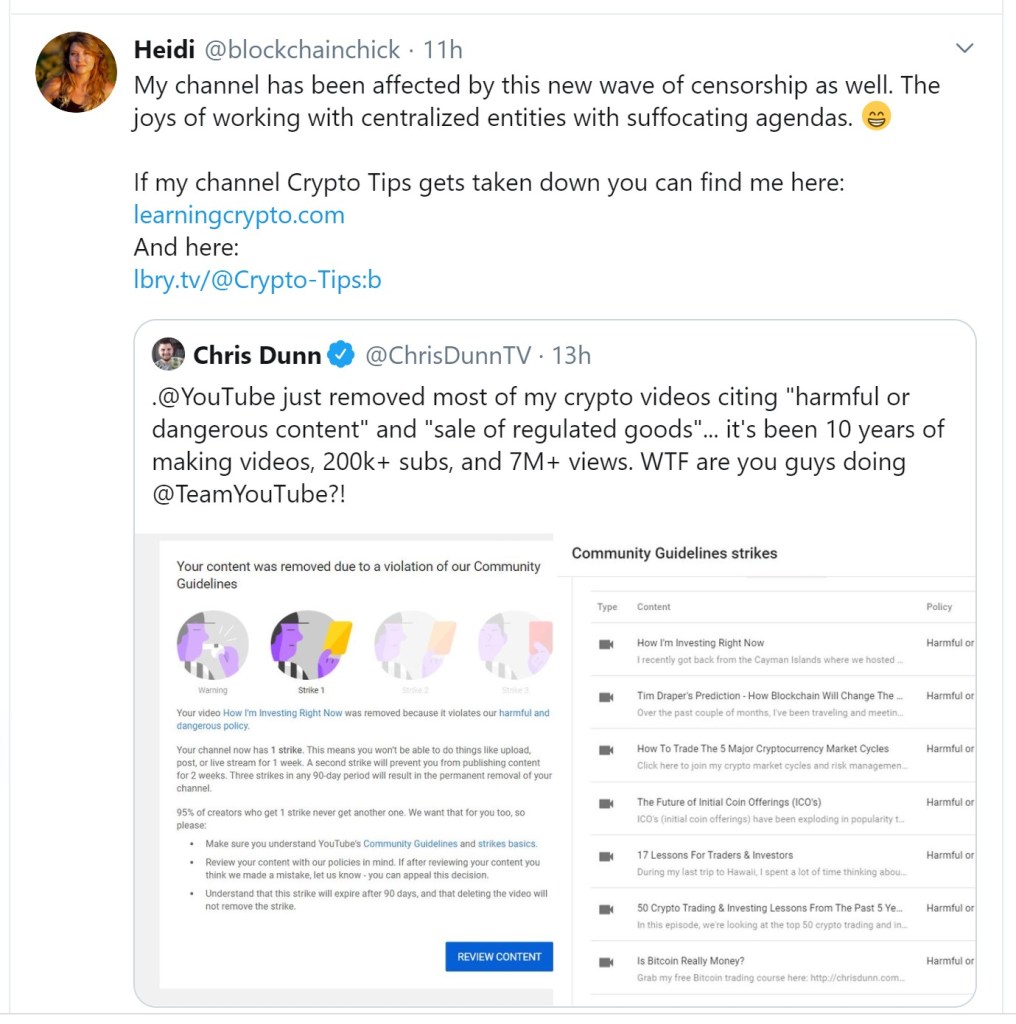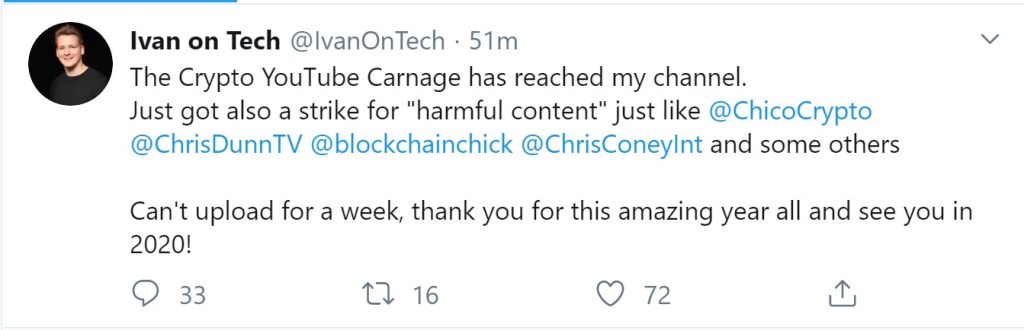 I’m probably least affected since only a few of my videos received the strike but other creators such as Chris Dunn, Heidi, BTC Sessions, Ivan On Tech and Chico Crypto are reporting a much bigger scale of the attack coming from Youtube right now.