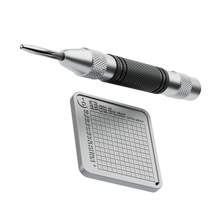 Simply explained, with these plates, you will not be stamping your seed phrase in its original form. You use encrypted version of each word in a very clever and easy to follow method: every word in the BIP39 standard for seed generation has a corresponding number, which you will stamp onto the plate with a stamping tool (provided.)