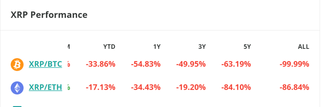 In other words: the XRP Army (the long term holders) are rekt, they’ve lost a ton of unrealised profit by holding onto an asset that has lost 99% of its value against Bitcoin (according to all time data provided by coincheckup below) and 84% of its value in USD since 2018 – the ATH of XRP was on 4 Jan 2018 when the token reached $3.92. The token was never able to reach this price point again, even in the last bull market, while all other tokens were printing new ATHs, XRP was left in the gutter. Too many investors were burning their money in XRP for a good while. For a long time XRP was the go-to token for new investors looking for quick profits – the token was billed to become the next big thing in crypto, banks were going to use it to compete with Swift and all that jazz… but this never materialised, and with time the expectation of a big, bright future has been diminished.