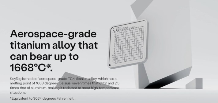 It is made from Aerospace-Grade Titanium. To be precise, it is TC4 titanium alloy, known for its exceptional strength and durability. This material can withstand extreme temperatures, with a melting point of 1668°C (3034°F), making it resistant to fire damage. It’s also waterproof and resistant to chemical corrosion, including acids and alkalis. This ensures that your seed phrases remain intact even in adverse environmental conditions.