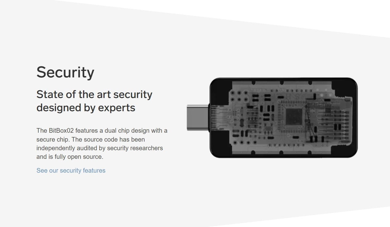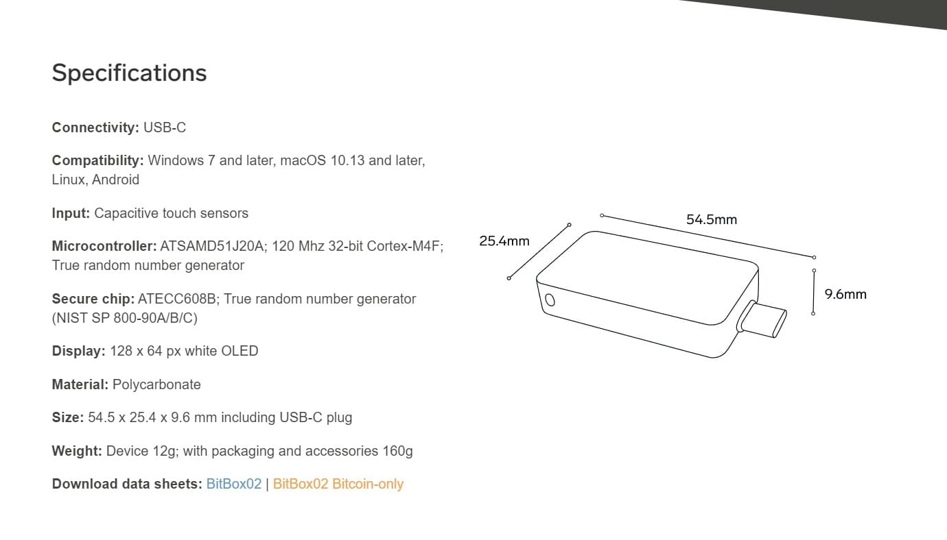 The device features a dual chip design with a secure chip. The dual chip design is a security concept pioneered by BitBox, which separates the wallet’s private keys from the device’s main microcontroller. The secure chip used in the BitBox02 is the ATECC608B, which is a true random number generator.