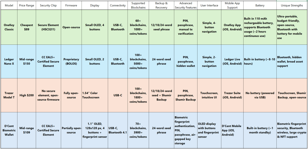 If you’re wondering how it compares to big names like Ledger Nano X, Trezor Model T, or the D’Cent Biometric Wallet, here’s the gist: