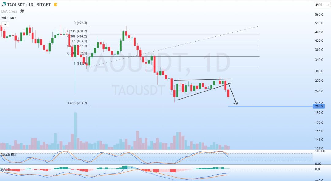 TAO, an altcoin in the author's portfolio, shows a bearish trend with a significant price drop. Support levels could stabilize or lead to further declines, influenced by Bitcoin's performance.